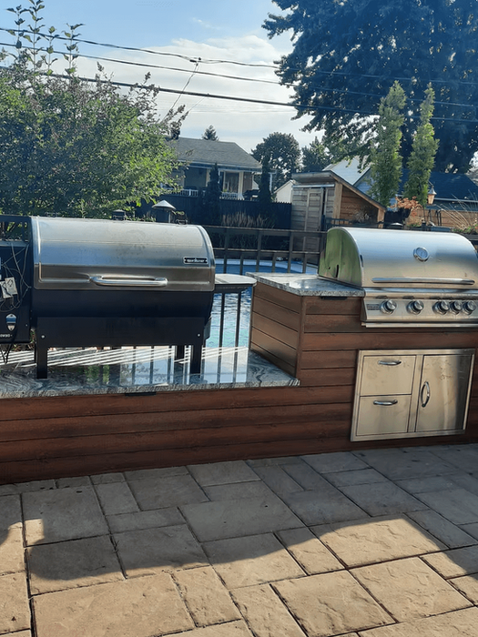 Offrez-vous le cachet du bois et la tranquillité d’esprit de l’aluminium, dans une cuisine extérieure conçue pour durer.